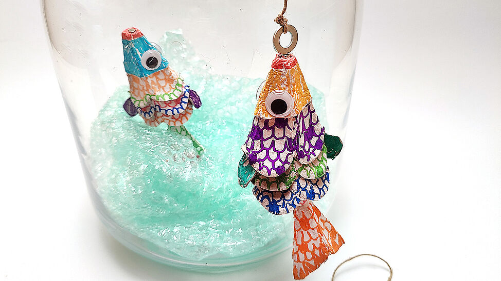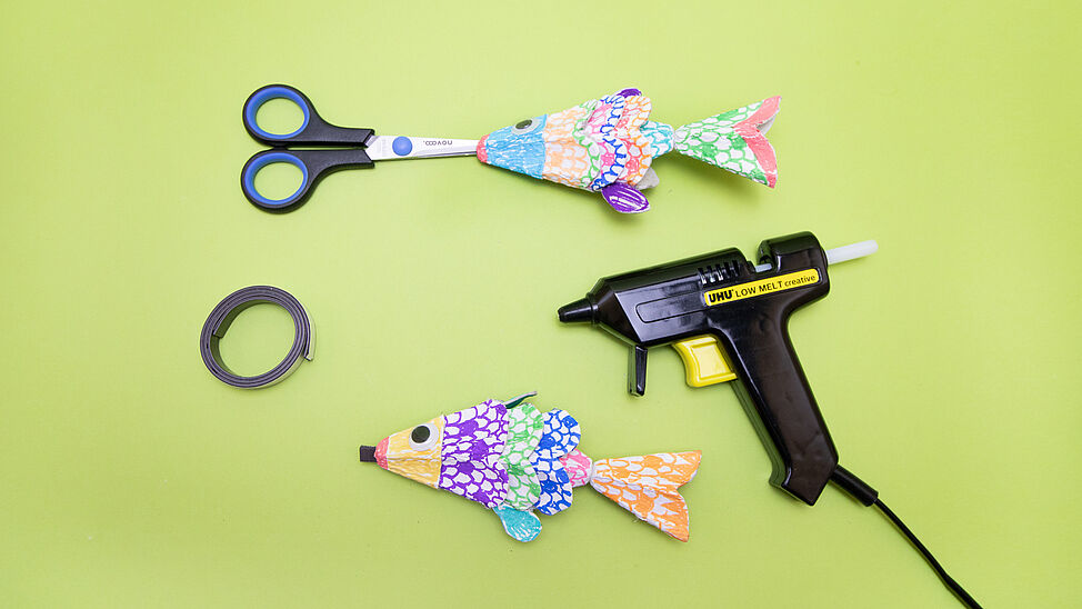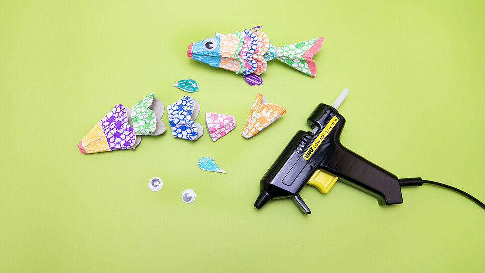 Klebe die Teile mit Heißkleber zu einem Fisch zusammen und befestige zum Schluss ein Wackelauge.
