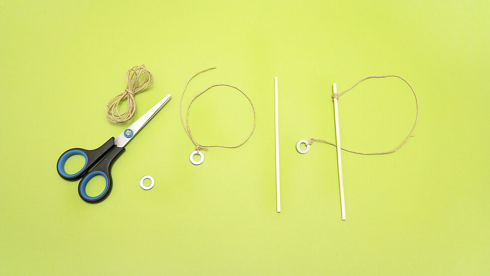 Knote eine Schnur an einen Holzstab und befestige am Ende einen kleinen Ring als „Haken“.