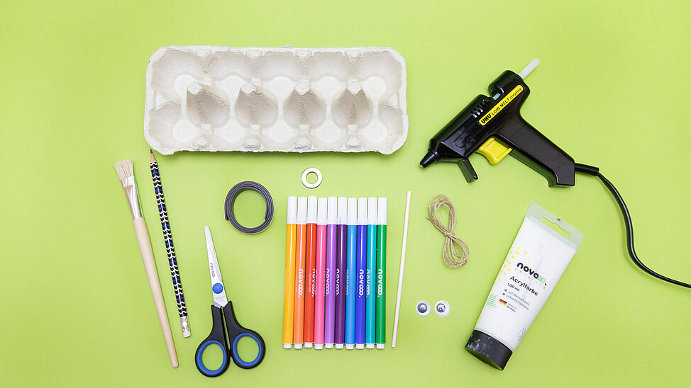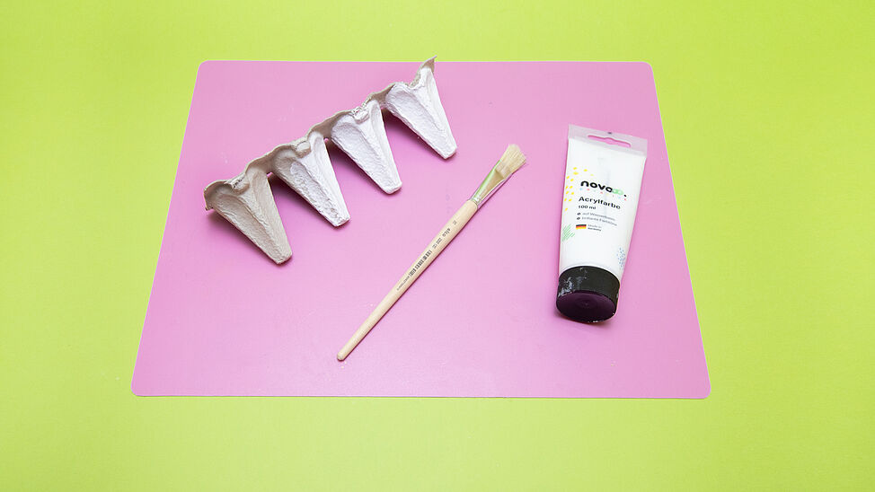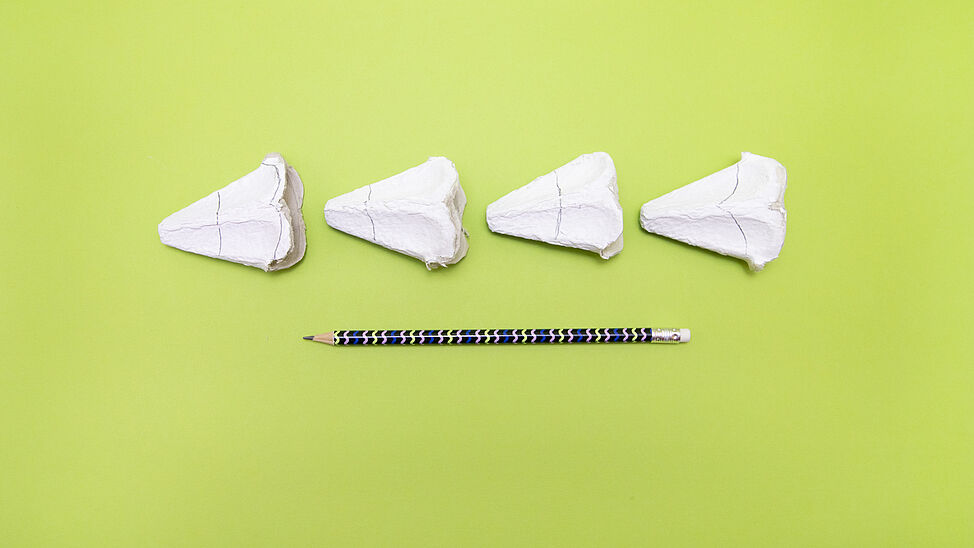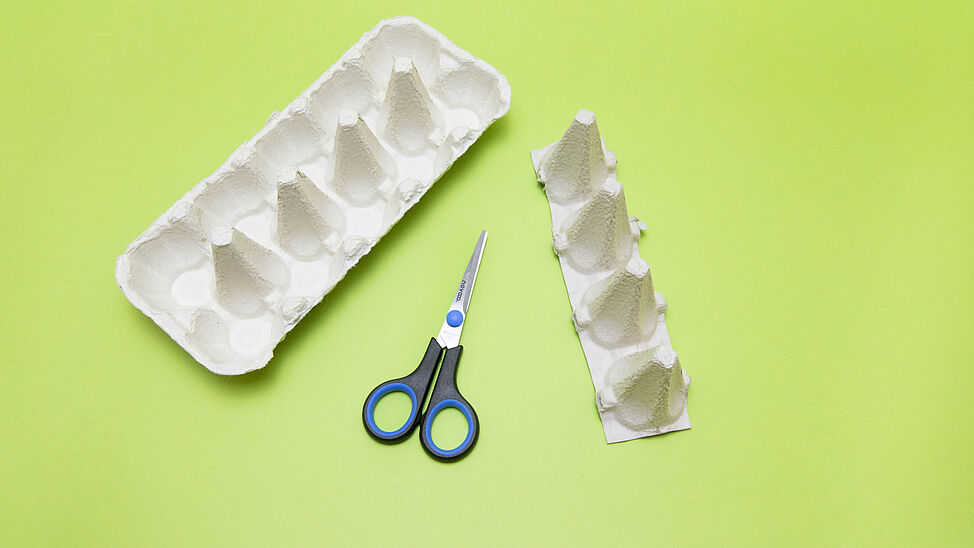 Schneide als Erstes den Eierkarton in passende Streifen und trenne die Karton-„Spitzen“ ab.
