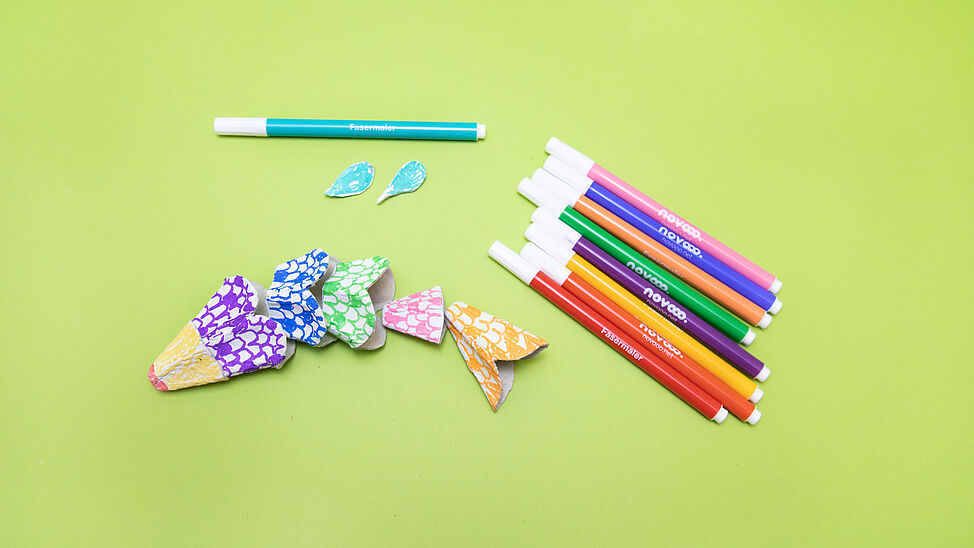 Verziere danach alle Teile bunt mit Filzstiften; Punkte und Wellen sehen besonders toll aus.