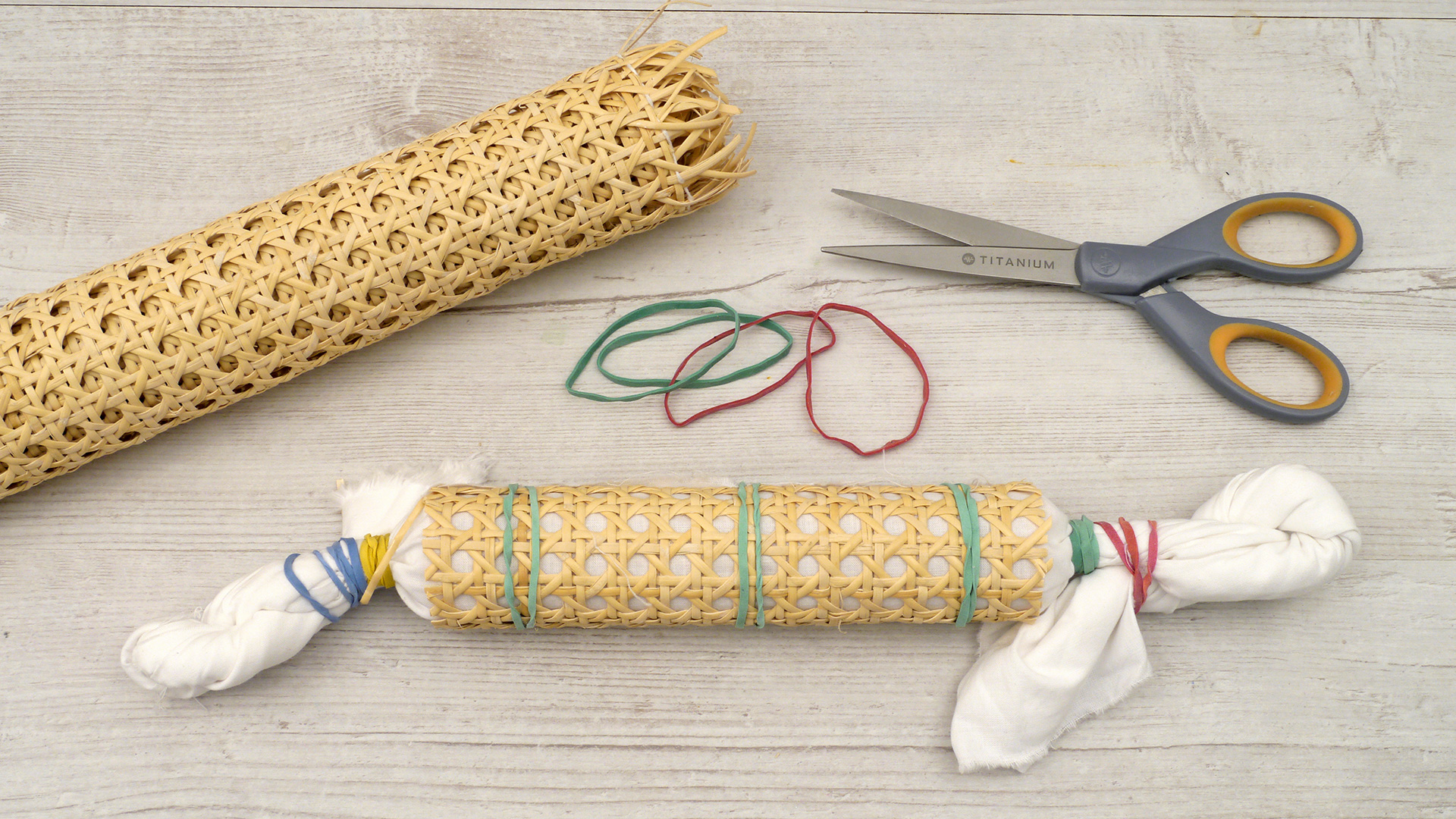 Zu Beginn schneiden Sie aus dem weißen Baumwollstoff mehrere Geschirrtücher in beliebiger Größe zurecht. Für die Batiktechniken werden nun alle Textilien gefaltet, gedreht und zusammengebunden.