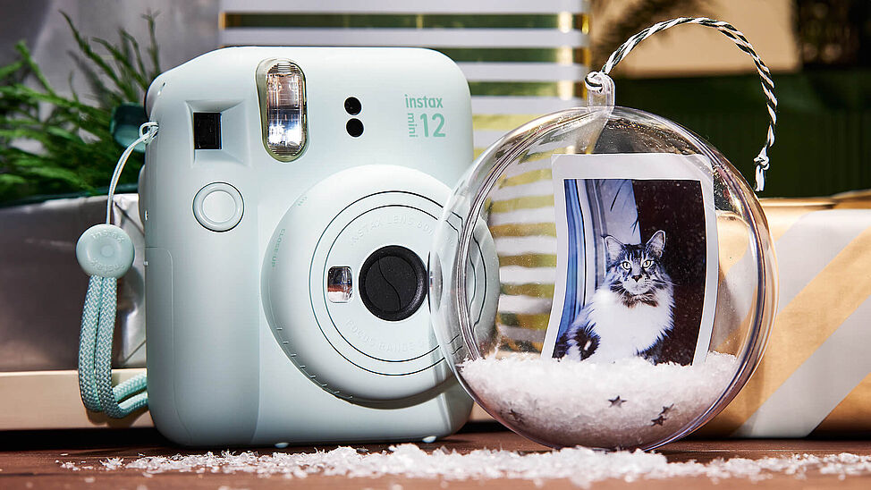 Lass den Christbaum Geschichten erzählen: Mit Fujifilm instax mini 12™ Sofortbildkamera werden Lieblingsmomente zu Kugeln und Anhängern, die jedes Jahr wieder Freude machen.