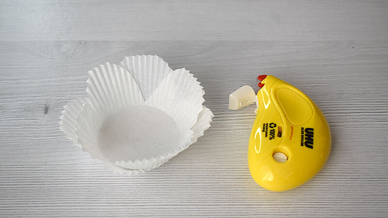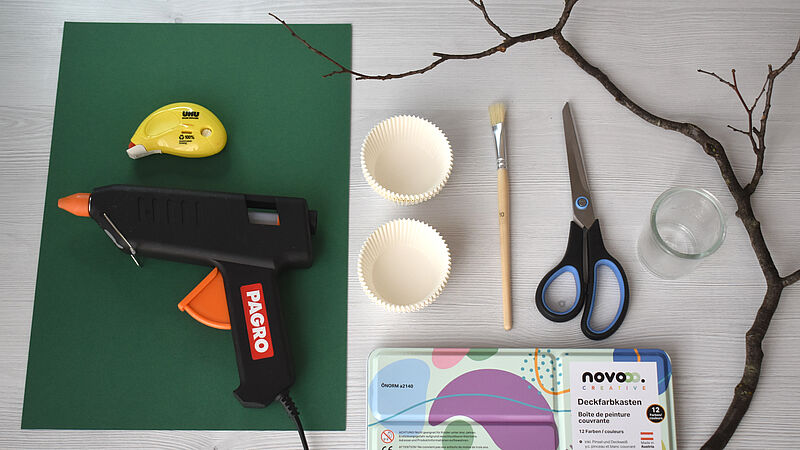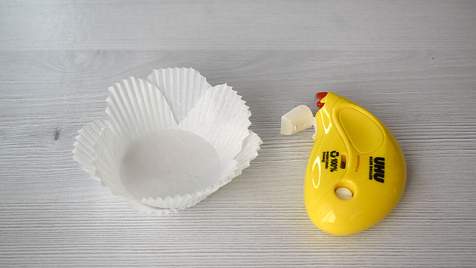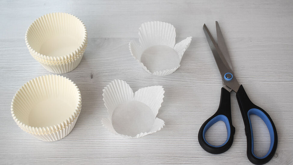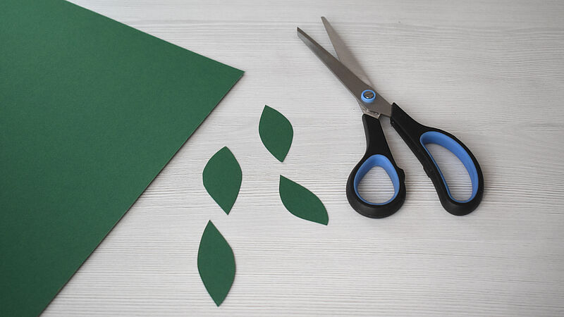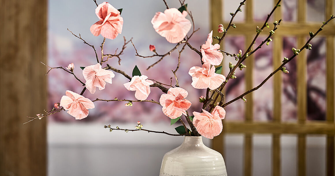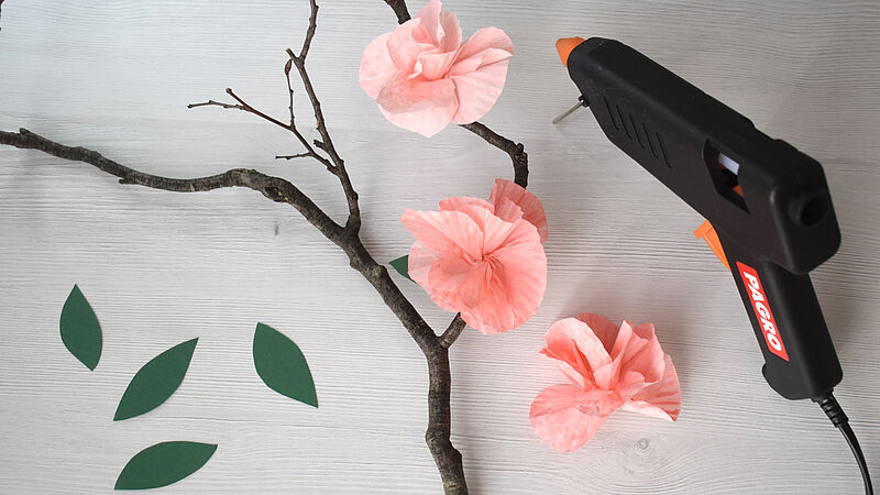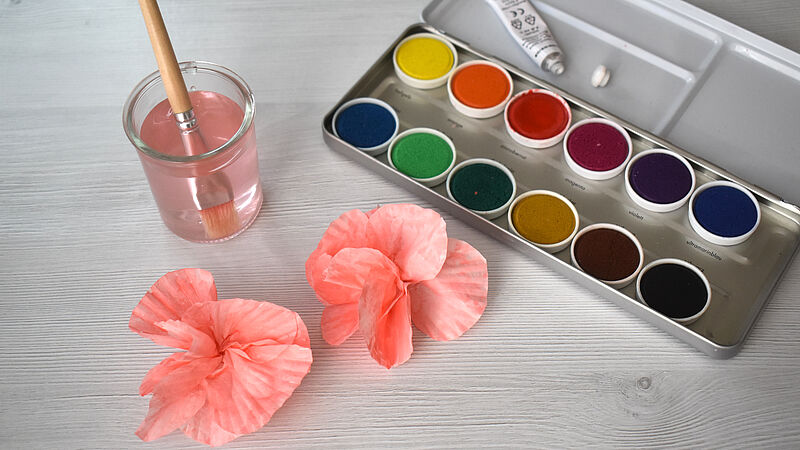 Vermische einen hellen Rotton mit weißer Deckfarbe und bemale die Blüten. Tauche dazu mit dem Pinsel in das Wasser und anschließend in die Farbe, so entsteht ein zarter Ton. Lasse die Blüten kurz trocknen, knülle sie dann locker zusammen und ziehe sie wieder auf – so entstehen natürliche Falten und eine schöne Blütenform.