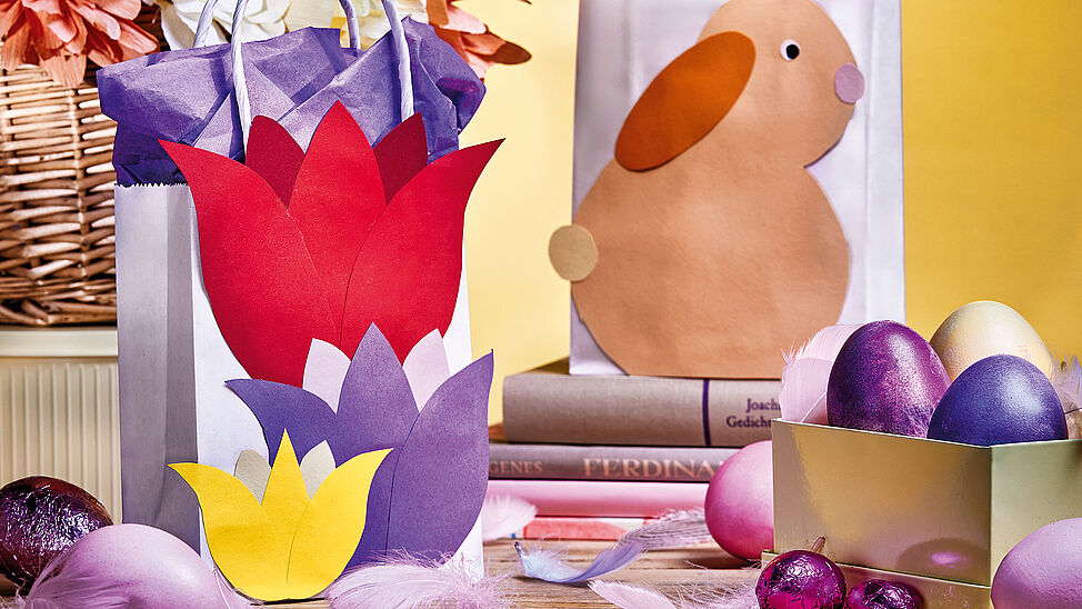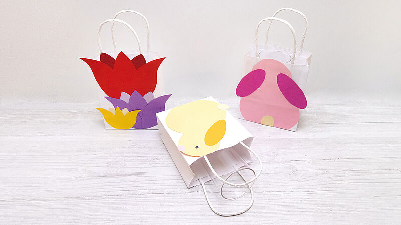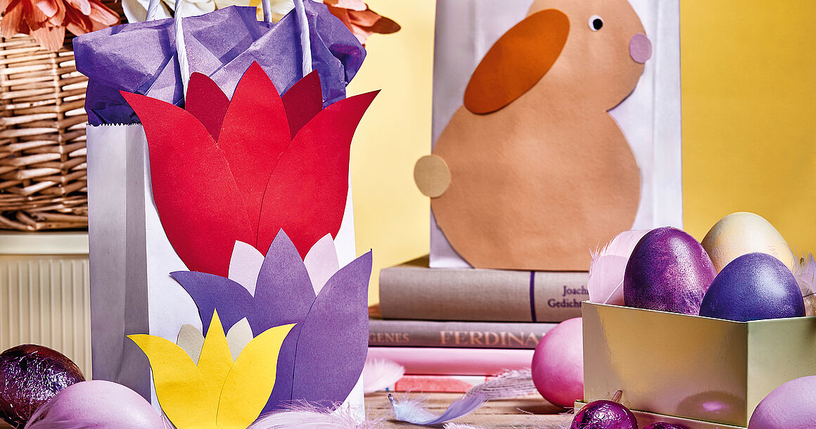 Diese fröhlichen Oster- und Frühlingstaschen lassen sich ganz leicht in dekorative Vasen verwandeln. Mit buntem Tonpapier, liebevollen Motiven und einem Glaseinsatz eignen sie sich perfekt, um frische Blumen stilvoll zu verschenken oder daheim willkommen zu heißen.