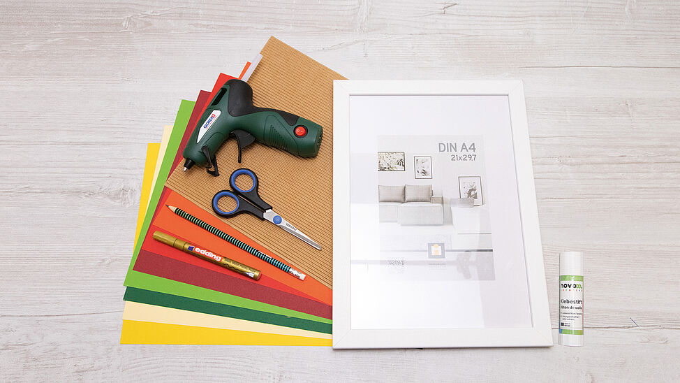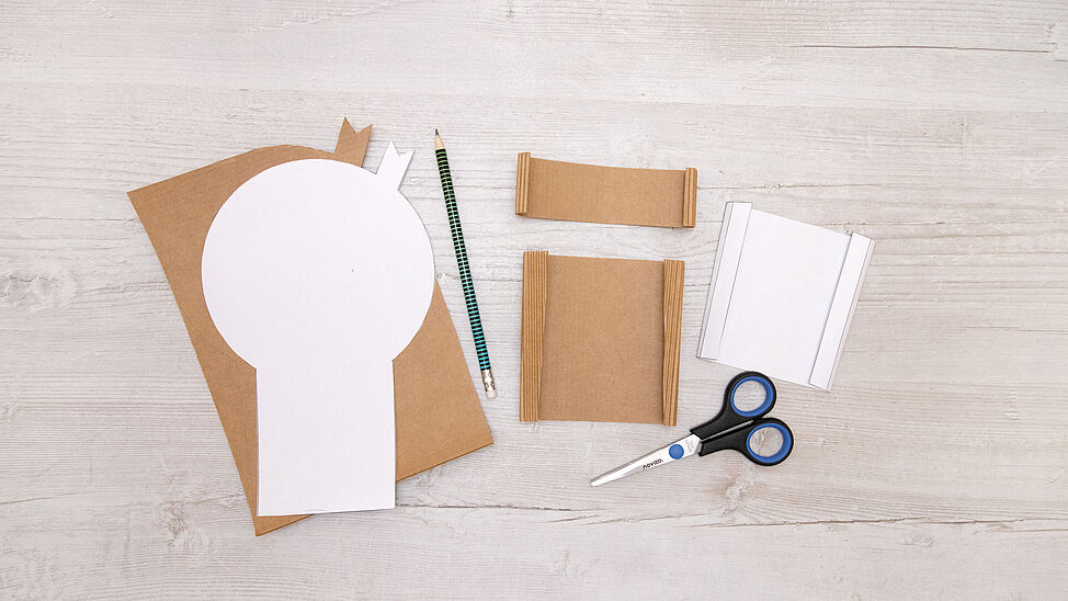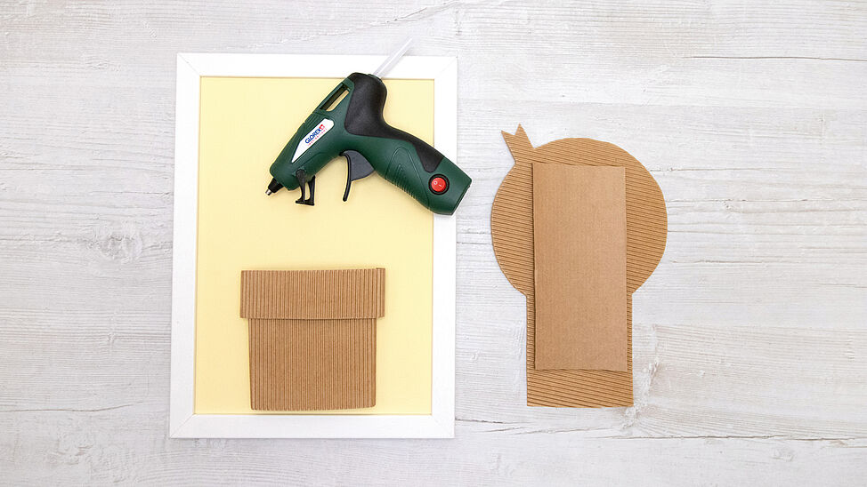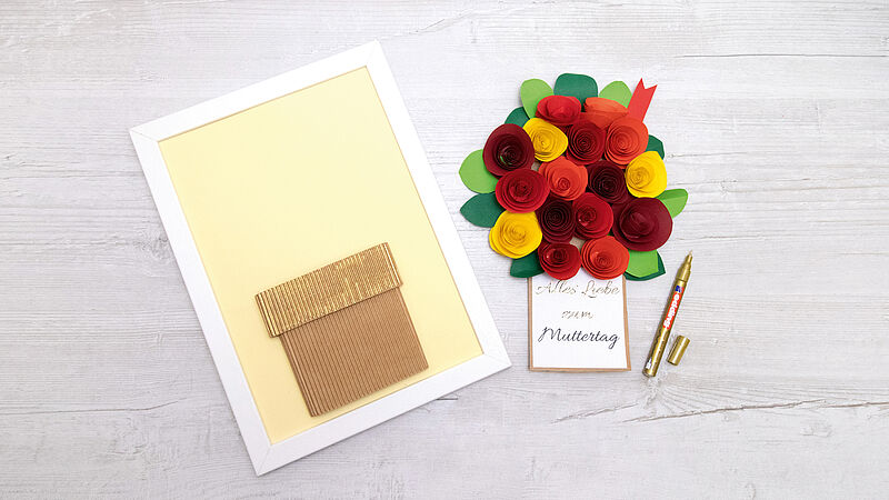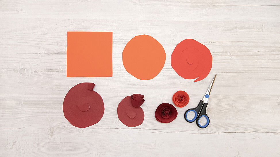 Schneide nun aus verschiedenfarbigem Tonpapier Kreise aus. Schneide jeden Kreis spiralförmig ein, sodass eine lange Papierlinie entsteht. Rolle die Streifen zu einer Rosenform zusammen und fixiere das Ende mit Heißkleber. Wiederhole den Vorgang, bis du genügend Papierblüten für deinen Strauß hast.