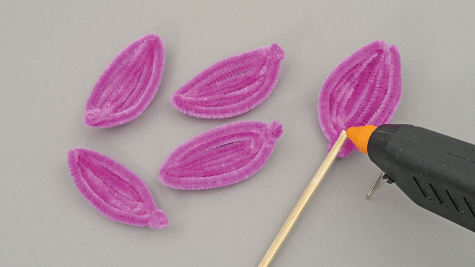 Forme mehrere dieser Blütenblätter auf dieselbe Weise und klebe die fertigen Blätter mittels Heißkleber auf einen Schaschlikspieß.