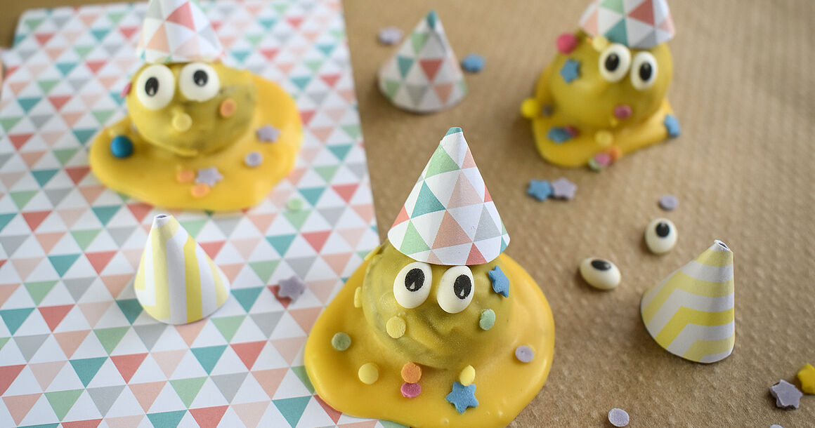 Tauche die Cakepop-Kugeln in die geschmolzenen Deco Melts und setze sie auf den vorbereiteten Klecks. Platziere Zuckeraugen und Streudekor auf der noch weichen Oberfläche.