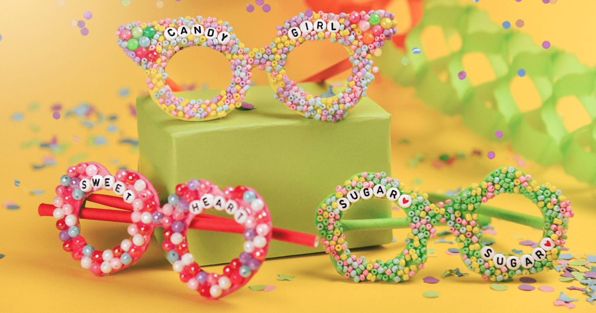 Mit einem bunten Outfit kombiniert ist die Candy-Brille das perfekte Accessoire für die Faschingszeit.