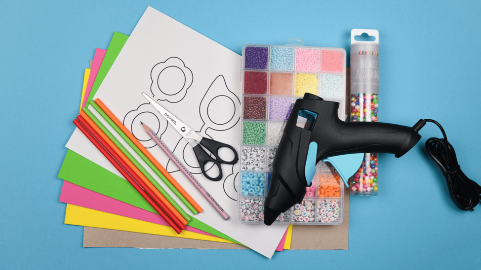 Verziere das restliche Brillengestell mit kleinen und großen bunten Perlen. Trage dafür portionsweise Heißkleber auf. Kleine Perlen kannst du einfach darüberstreuen, größere platzierst du gezielt.