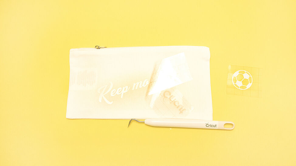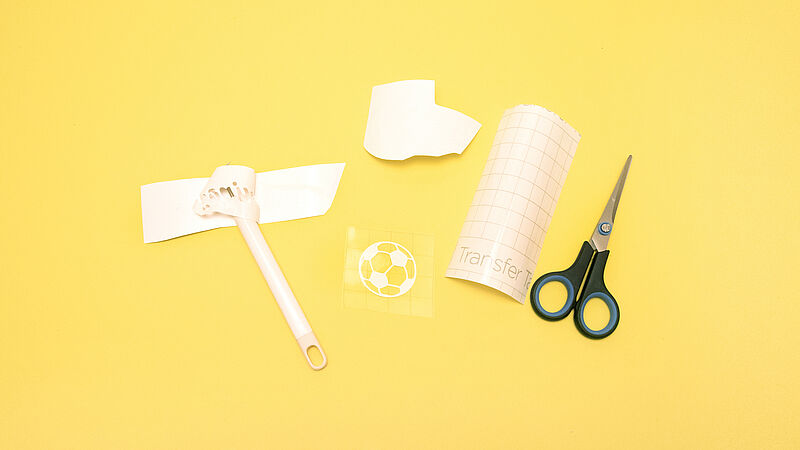 Entferne anschließend mit dem Werkzeug vorsichtig alle überschüssigen Vinylteile, sodass nur der Schriftzug übrigbleibt. Schneide ein passendes Stück Transfer Tape zu und klebe es über deinen fertigen Schriftzug. Drücke das Tape gut fest und löse den Schriftzug anschließend gemeinsam mit der Übertragungshilfe vom Trägerpapier.