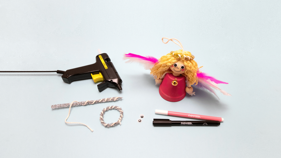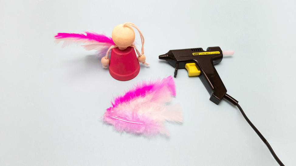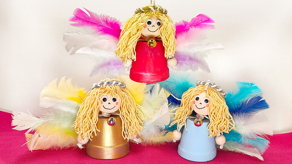 Aus einem kleinen Tontopf, etwas Wolle und bunten Federn entsteht ein fröhliches Engerl zum Aufhängen. Einfach zu machen, super zum Basteln mit Kindern – und ein süßer Blickfang am Baum.