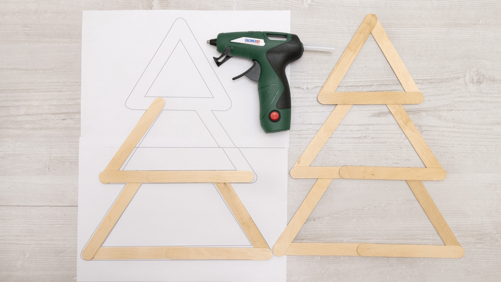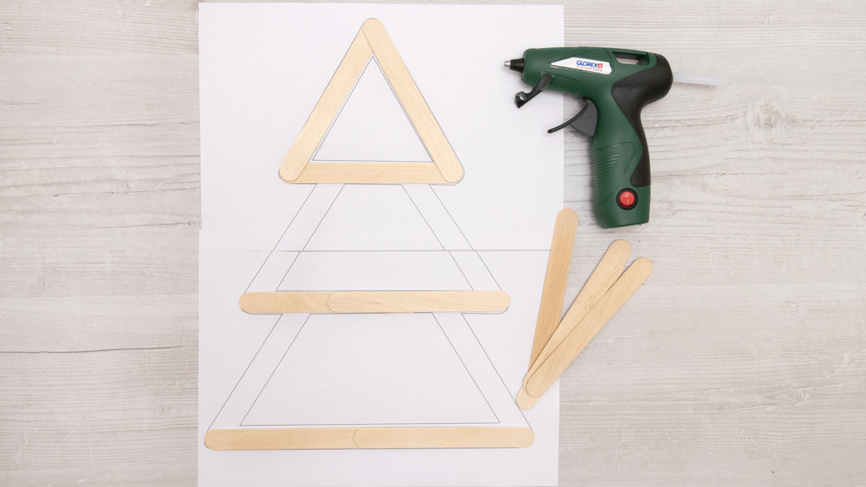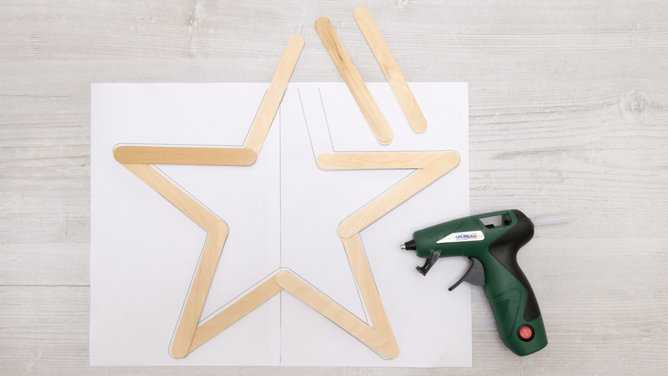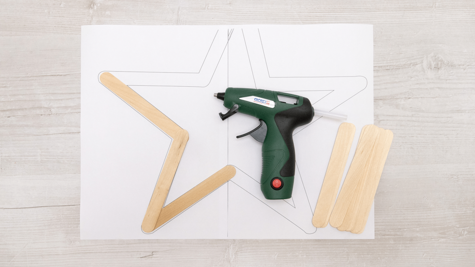 Drucke die Vorlagen für Stern und Tannenbaum aus, lege sie auf eine ebene Unterlage und fixiere sie ggf. mit Klebeband, damit nichts verrutscht; beginne anschließend, die Konturen mit Holzstäbchen auszulegen und die Stäbchen an den Stoßkanten mit kleinen Punkten Heißkleber zu verbinden.
