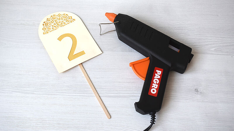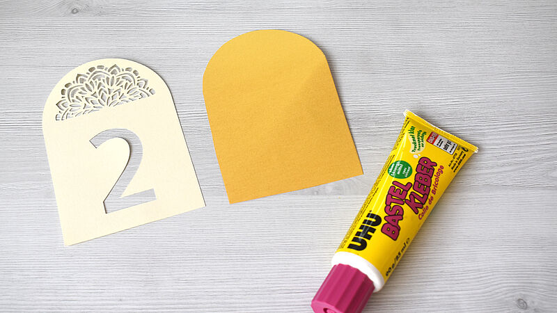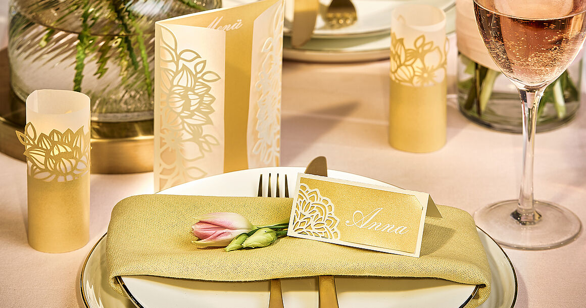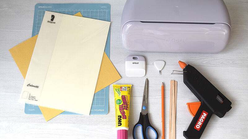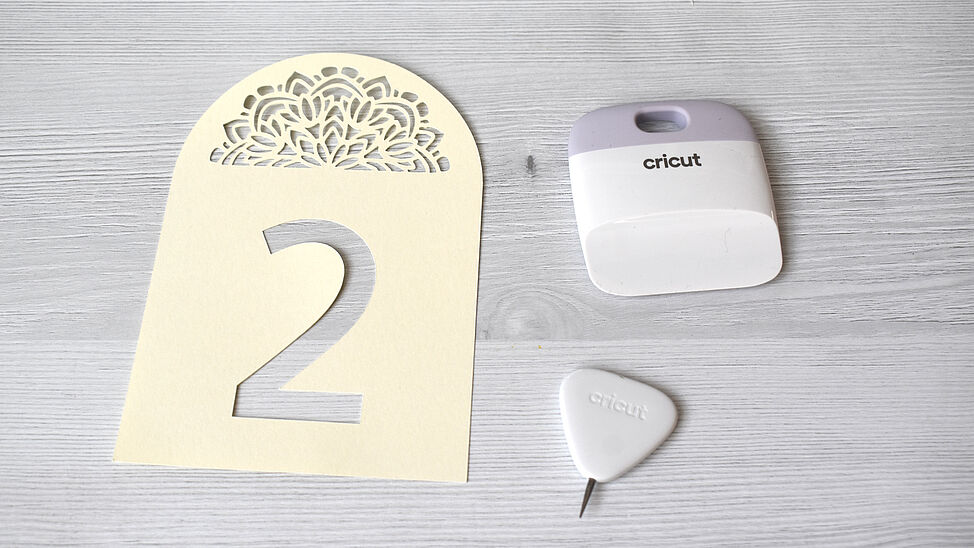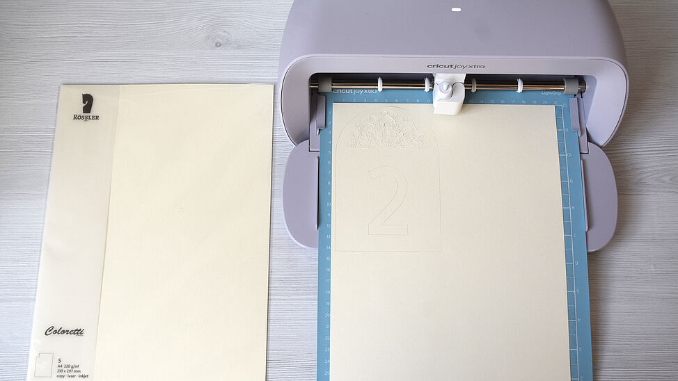 Lege zu Beginn die Schneidematte sowie das cremefarbene Papier in deinen Cricut Joy Xtra und schneide die Tischnummer laut Vorlage samt Spitzenrand aus.