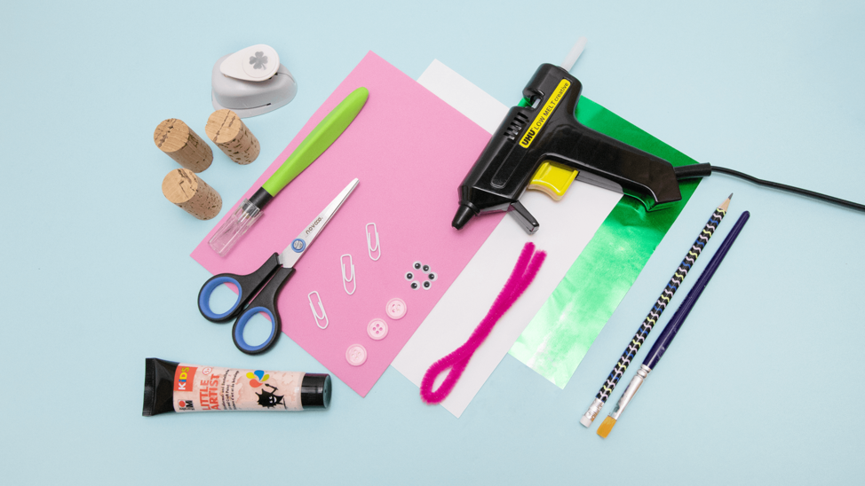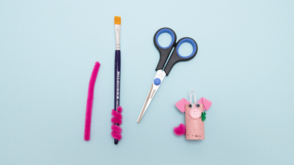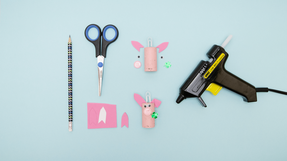 Hier findest du die Vorlagen für die Ohren. Übertrage die Form auf das rosa Moosgummi, schneide sie aus, klebe sie seitlich oben an und knicke die Spitzen nach unten. Klebe Wackelaugen und den Knopf als Rüssel auf die Vorderseite. Das Kleeblatt kommt seitlich als Glücksdeko dazu.