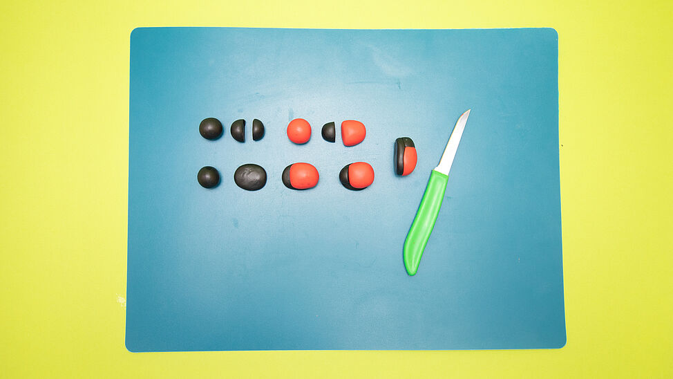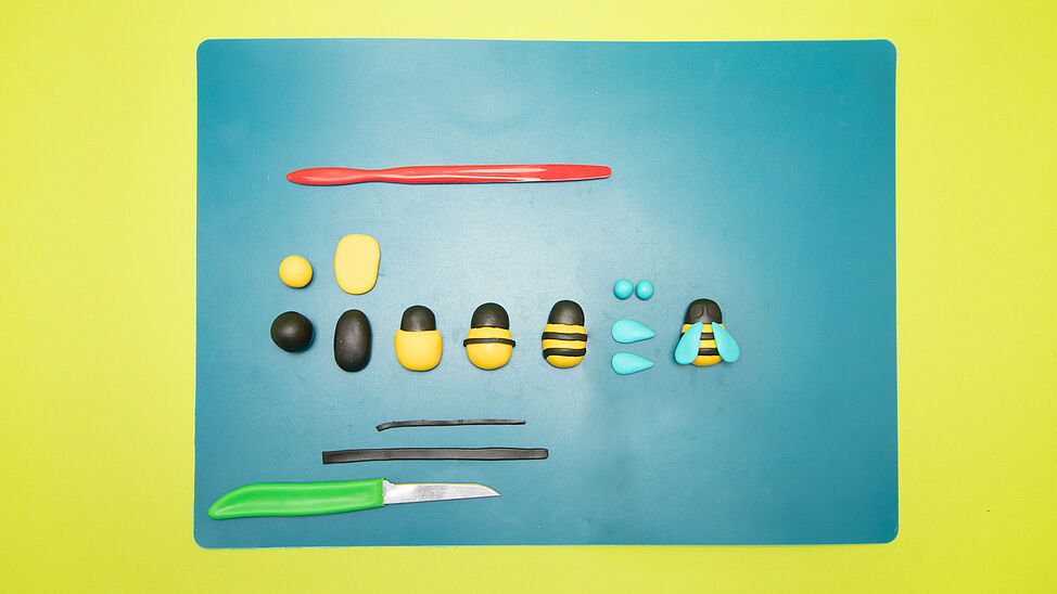 Für die Bienen forme aus schwarzem Fimo wiederum den Körper, rolle das gelbe Fimo dünn aus und setze es auf den Körper auf. Der Kopf bleibt schwarz. Forme kleine schwarze Streifen und lege diese über den gelben Körperteil darüber. Aus hellblauem Fimo kannst du noch Flügel formen und diese am Rücken der Biene befestigen.