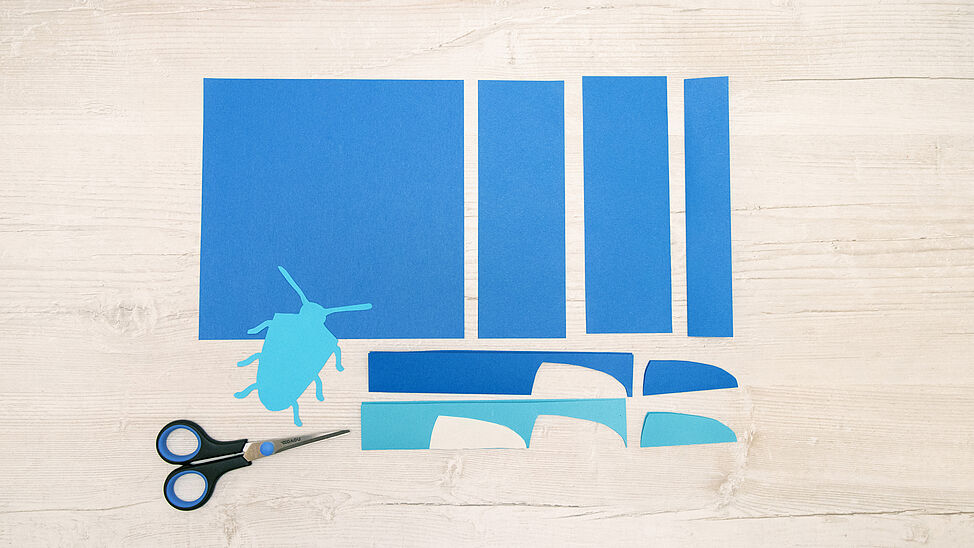 Lege das Graphit-Kopierpapier zwischen Druckvorlage und Tonpapier, übertrage die Konturen mit dem Bleistift und schneide die Grundform (z. B. Käferkörper) sauber aus.