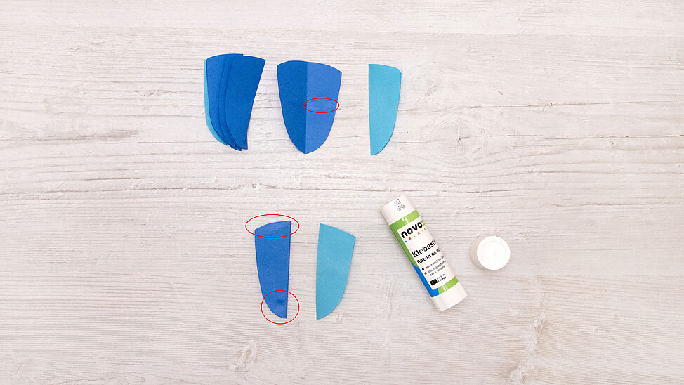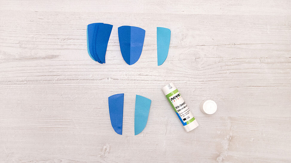 Schneide aus Origamipapier mehrere gleich große Waben-Elemente zu (wie im Bild als Streifen/Rechtecke vorbereitet) und runde sie nach der Druckvorlage zu kleinen Segmenten ab.