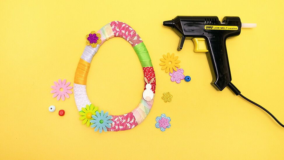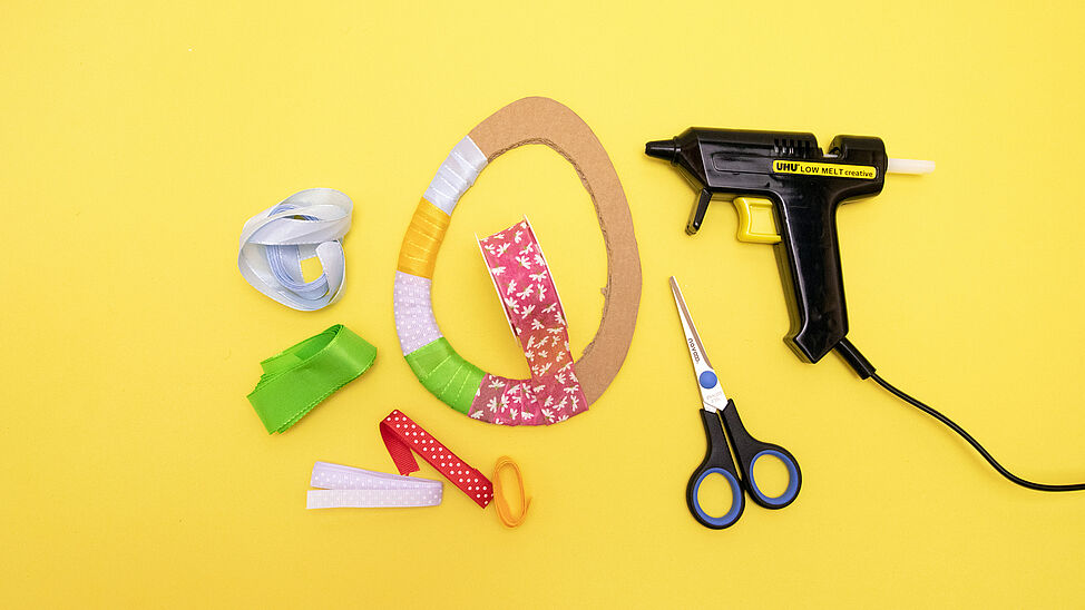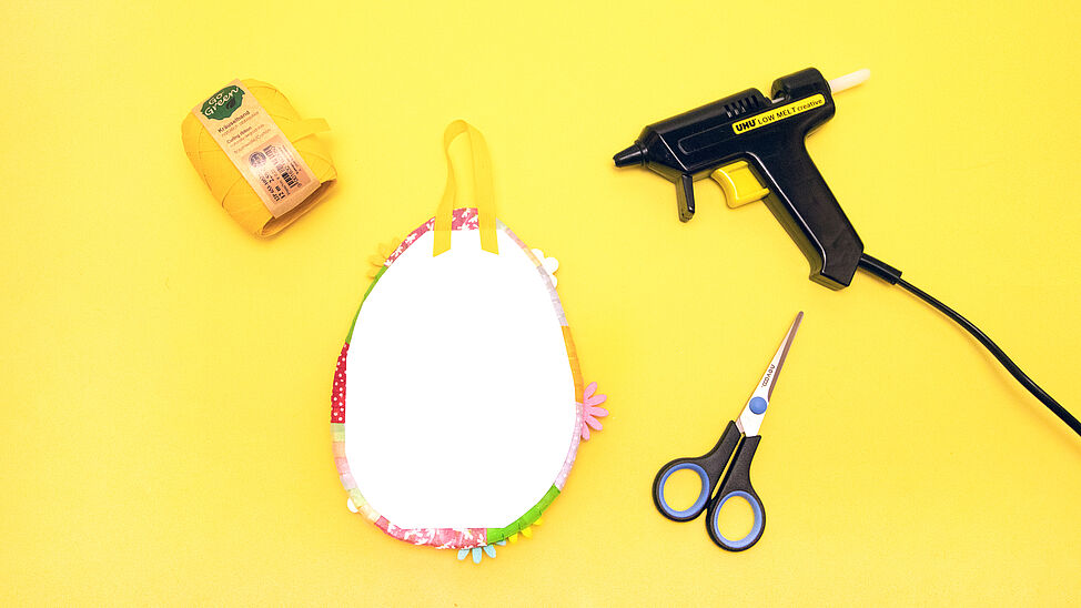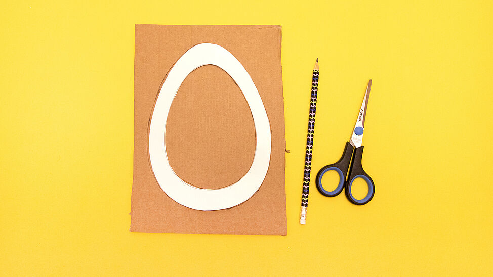 Zeichne mithilfe der Vorlage, die du auf HIER findest, die Umrisse eines großen Ostereis auf einen Karton und schneide die Form aus.