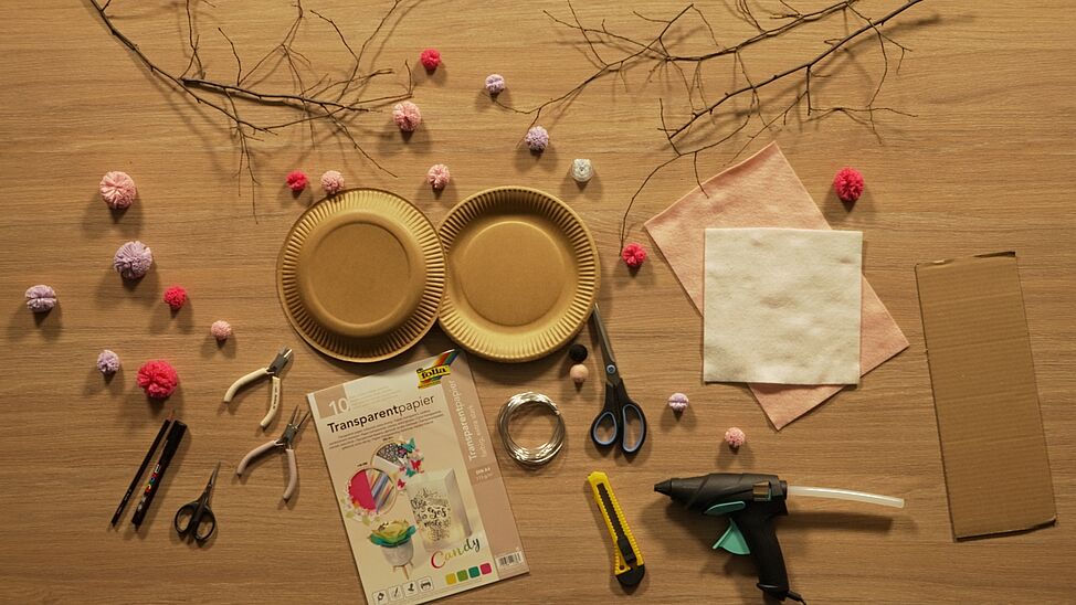 9. Bringe Zweige als Geweih am vorderen Pappteller an.