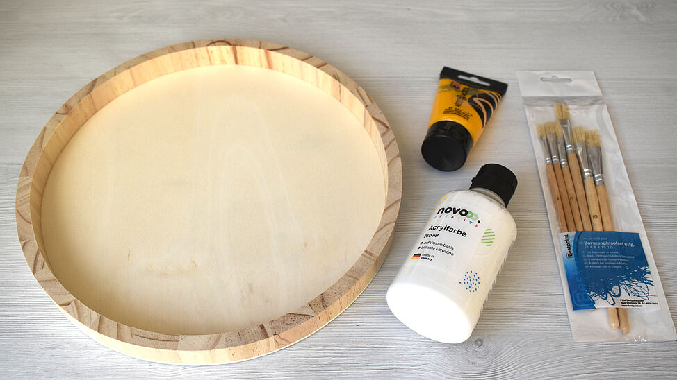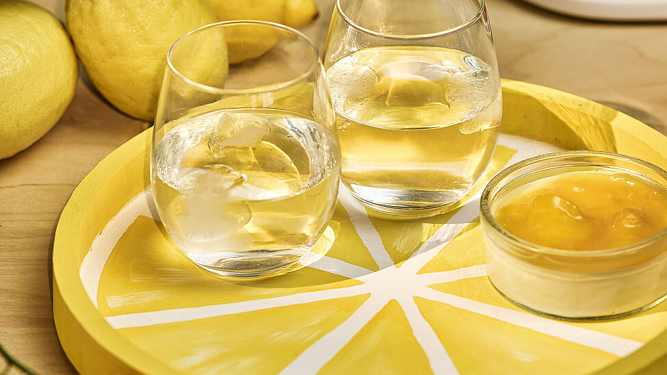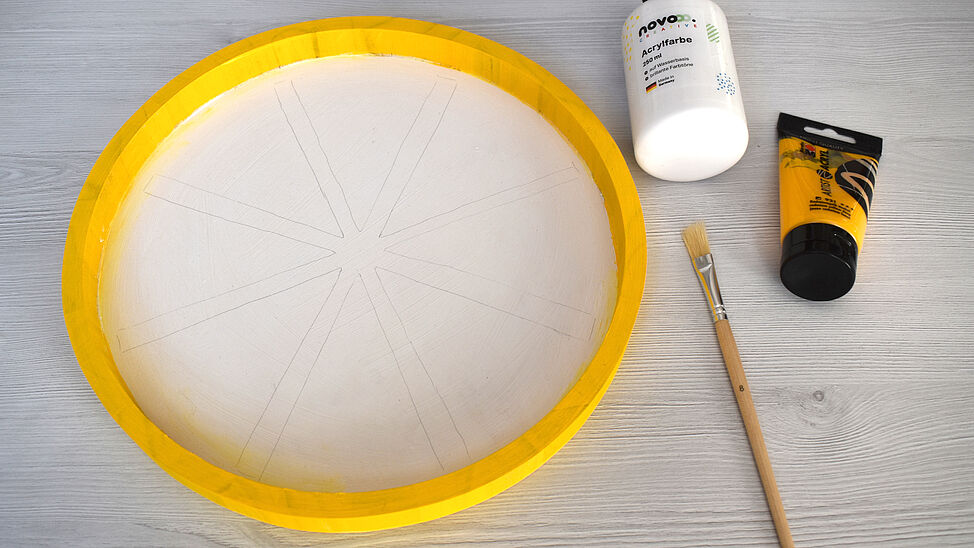 Mit diesem selbst gestalteten Zitronentablett holst du dir frisches Sommerfeeling direkt auf den Balkon oder deinen Frühstückstisch. Alles, was du dafür benötigst, ist ein Holztablett, Acrylfarben und ein paar Bastel-Basics wie Pinsel und Schere.